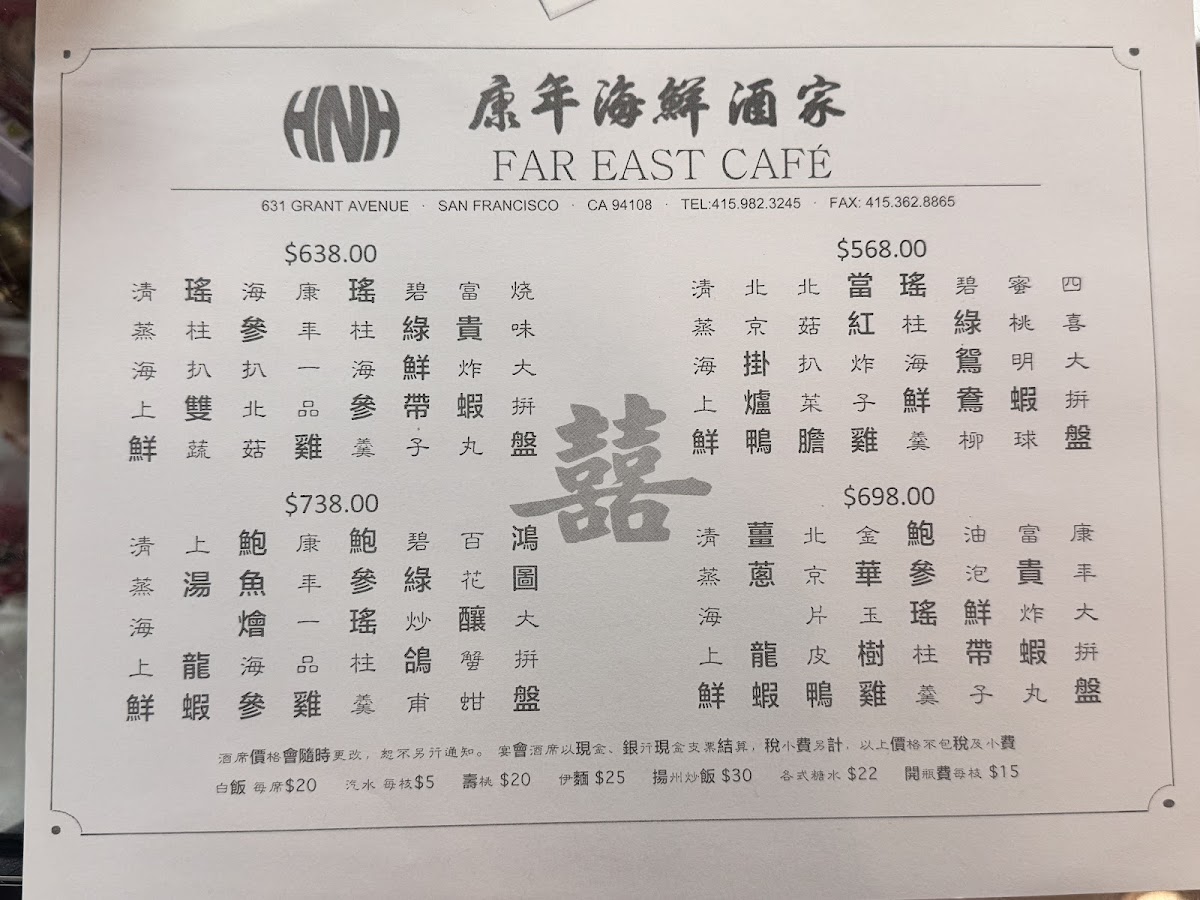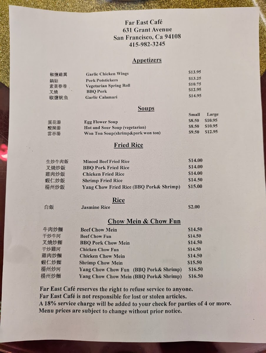 Welcome to Far East Cafe, a celebrated Cantonese restaurant tucked away at 631 Grant Ave, San Francisco, CA. Immerse yourself in an atmosphere steeped in history, complete with charming decor and century-old chandeliers. The menu features an enticing range of dishes, primarily focusing on their stellar chicken and seafood offerings.
